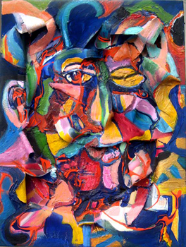 “Plane slashing” is the latest progression of my 3D technique; lately I’m tearing, cutting and manipulating the plane of an existing painting, while integrating it with one or more finished canvases that I’ve attached. I paint into the entire deconstructed imagery, leaving various portions of the underlying picture(s) in tact. I love taking paintings from destruction and chaos and transforming them into a cohesive multi-dimensional piece.