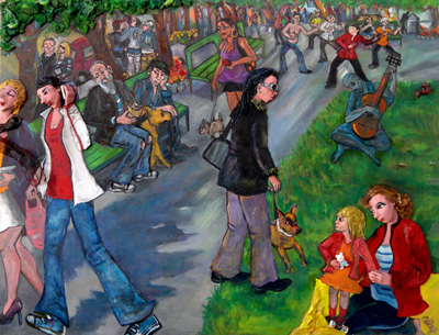 For many years I’ve been creating “Peoplescapes,” oil, sculptured characters and applied objects on canvas, addressing cultural, political and spiritual issues facing society. By juxtaposing people in recognizable places and situations, each painting weaves together a story about contemporary life, filled with layers of detail, symbolism and humor. “Plane slashing” is the latest progression of my 3D technique; lately I’m tearing, cutting and manipulating the plane of an existing painting, while integrating it with one or more finished canvases that I’ve attached. I paint into the entire deconstructed imagery, leaving various portions of the underlying picture(s) in tact. I love taking paintings from destruction and chaos and transforming them into a cohesive multi-dimensional piece. Contact: |